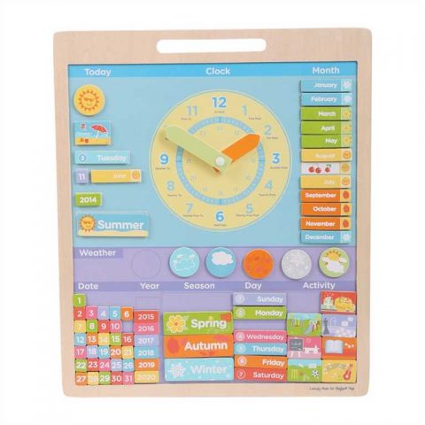 Tento pestrofarebný magnetický kalendár s počasím pomôže malým deťom naučiť sa všetko o rôznych ročných obdobiach. Farebný ciferník obsahuje pohyblivé ručičky, 12 a 24 hodinové hodiny a praktické poznámky