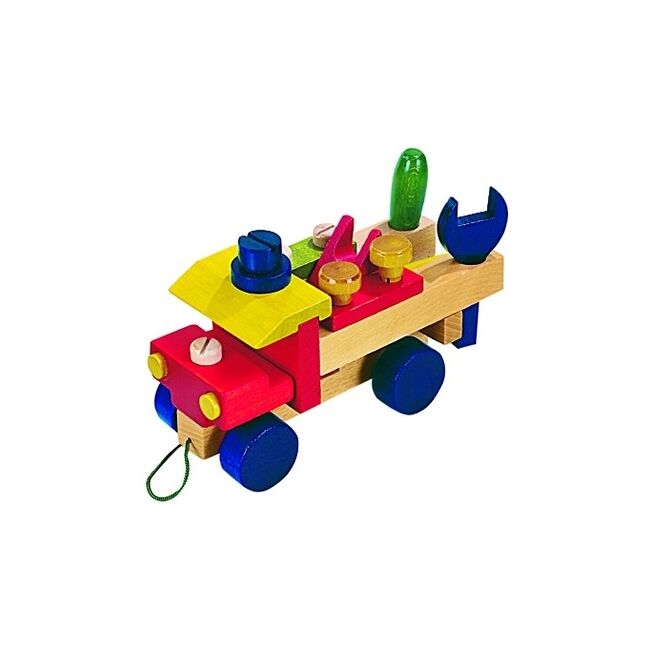 Drevené ťahacie montážne auto je zložené z montážnych častí a priloženého dreveného náradia.