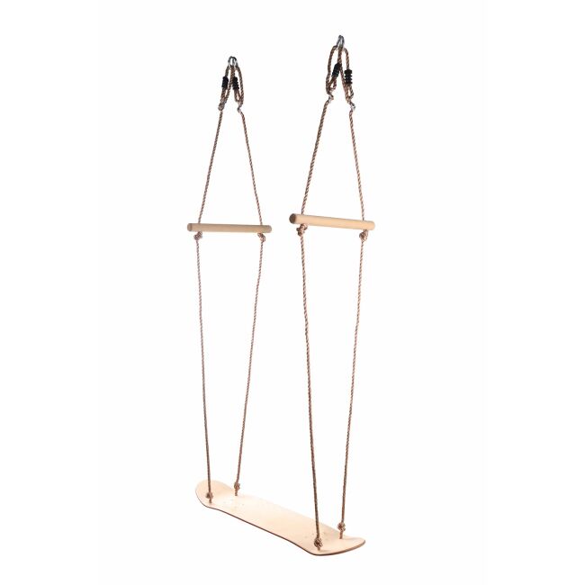 Drevená hojdačka skateboard s madlami a 2 karabínami pre zavesenie.