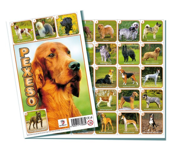 Pexeso s obrázkami rás psov. Hra sa po pozdĺžnom prerezaní skladá z 32 obrázkových dvojíc. Princípom hry je vyhľadávanie dvojíc. Karty sú pri hre otočené obrázkom dole a obracajú sa po dvoch. Je nutné zapamätať si námety obrázkov a miesto, na ktorom leží.