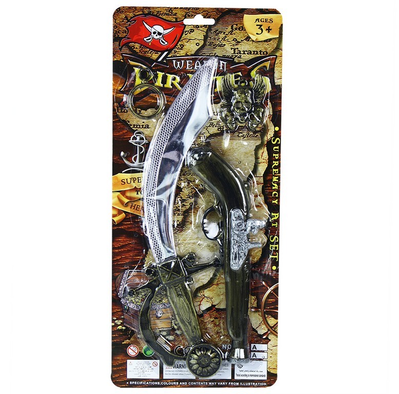 Set obsahuje strieborný meč s bronzovou rukoväťou, bronzovú pištoľ, náušnicu a pirátsky prívesok. Perfektné doplnky ku kostýmu piráta.