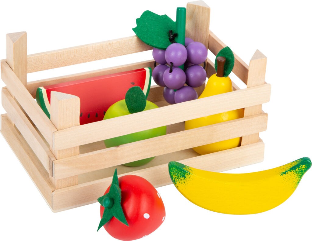 Tento chutný herný set sa bude vynímať v každej hernej kuchynke alebo predajnom stánku. Drevená prepravka je naplnená 2 jablkami, 2 pomarančmi, melónom, kivi a banánom z mäkkého plyšu. Plyšový banán deti môžu olúpať ako ten reálny, pretože je jeho šupka pripevnená suchým zipsom. Hračka trénuje motoriku detí a inšpiruje ich k kreatívnej hre. Naučte svoje deti o dôležitosti zdravej a vyváženej stravy.